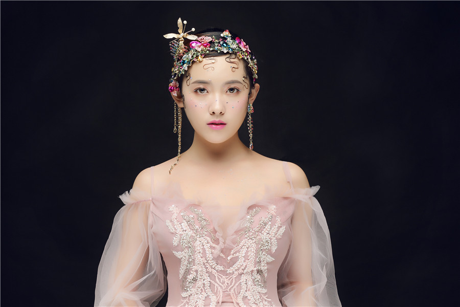 南寧化妝學校原創(chuàng)作品分享:美要流行于外表,更要浸透入骨,運用色彩創(chuàng)意,讓新娘曼妙靈氣,仿佛晨曦里落入人間的小仙女。