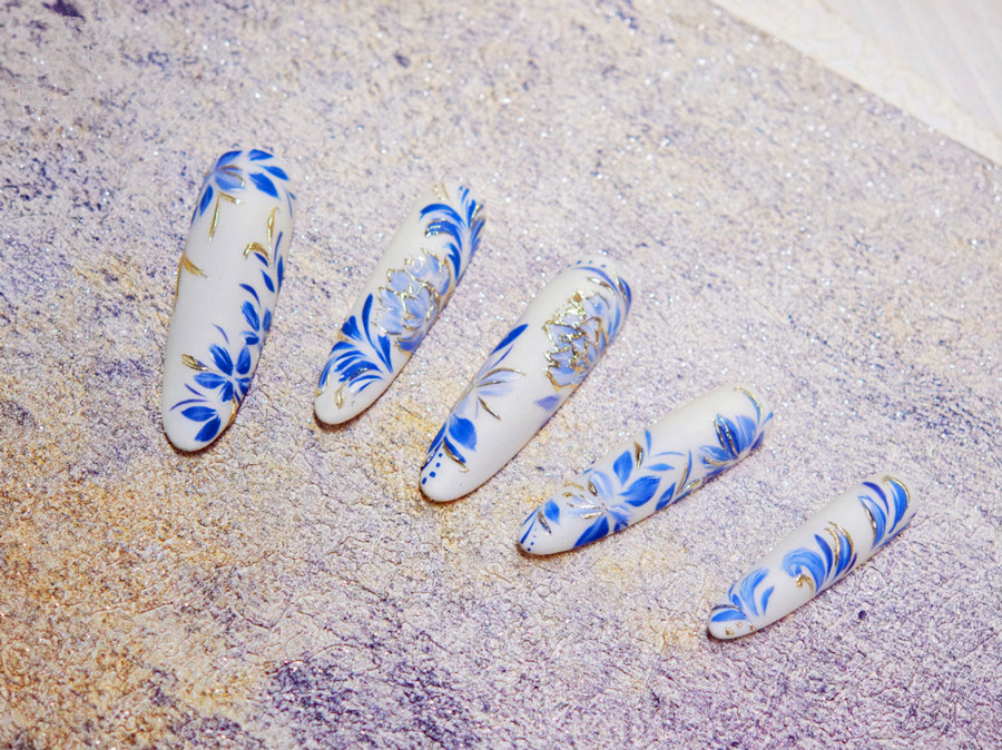 整副美甲作品,汲取國風(fēng)經(jīng)典青花元素作為整副美甲的主體。以乳白色作為底色,再涂抹磨砂封層增加質(zhì)感。之后,用彩繪筆繪畫出花瓣,蘸取金屬膠勾勒花瓣邊緣,打造古典國風(fēng)氣息的同時(shí),更添加了幾分雅韻。
