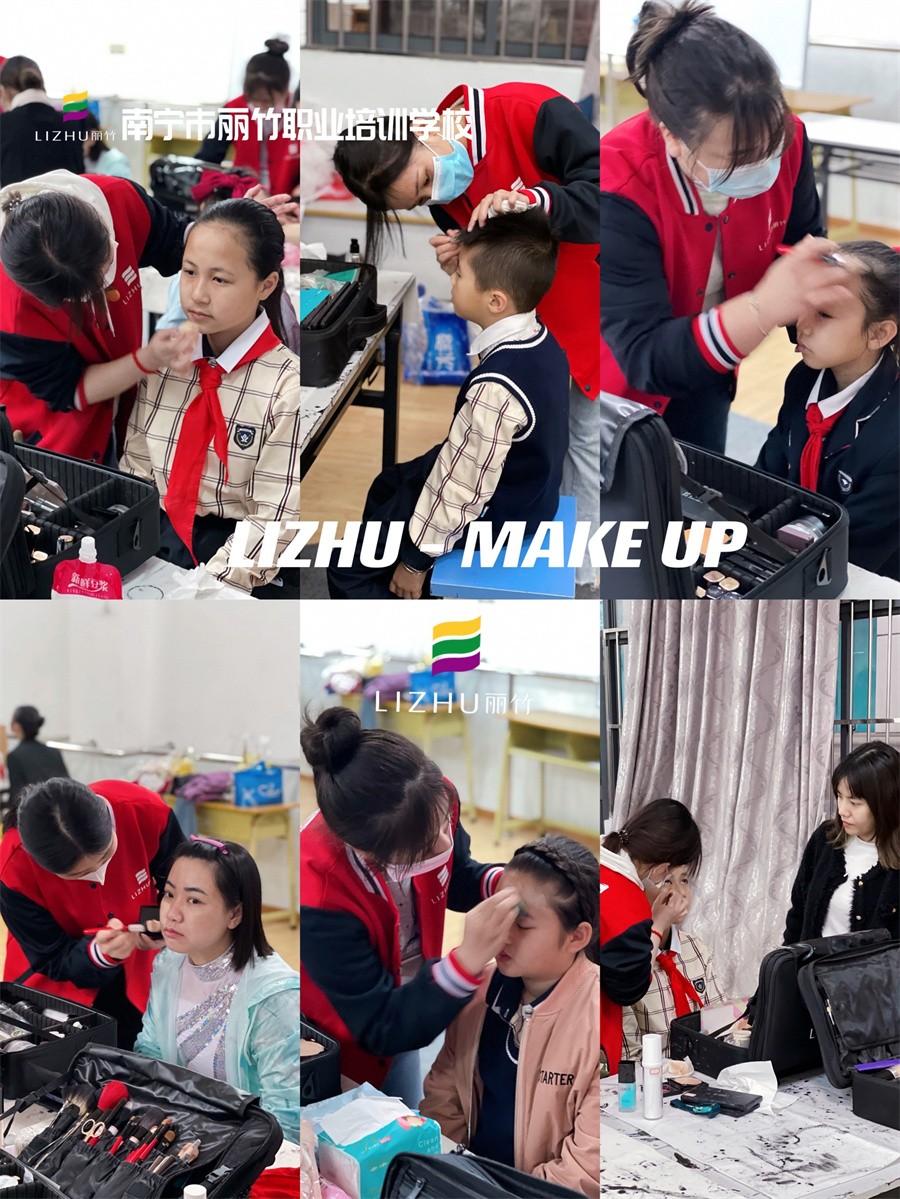 廣西彩妝班外出活動、廣西化妝學校實踐:學以致用,方有用!廣西彩妝造型化妝學校-麗竹彩妝造型學校為了讓學員們可以將課堂學到的技術,真正運用到實踐當中,近日組織學員為民盟南寧市委2023文藝演出的表演人員提供化妝服務。