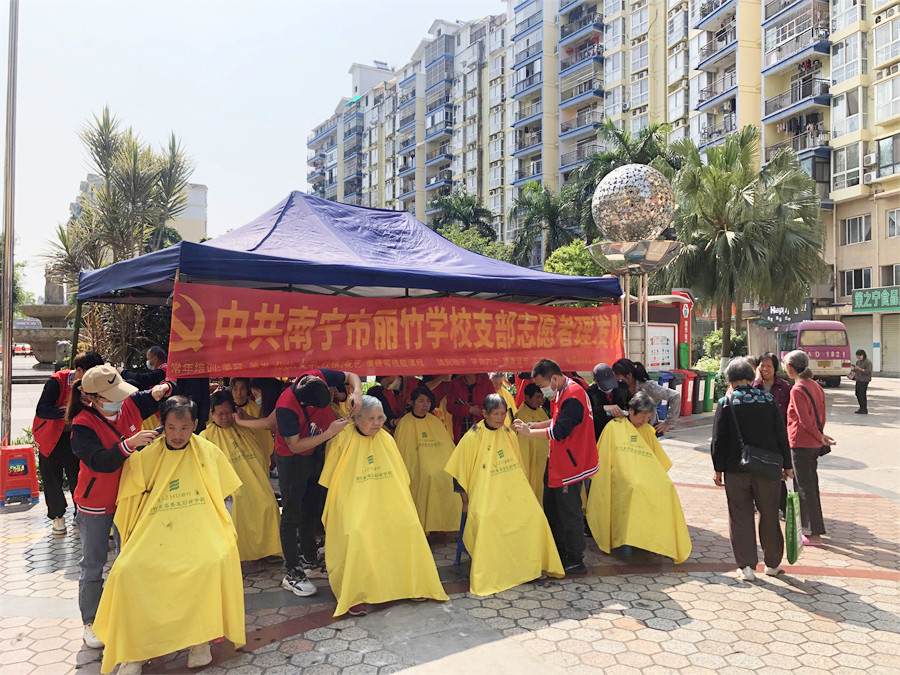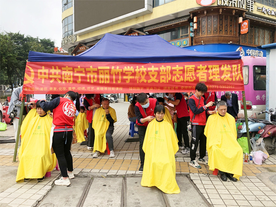 廣西南寧市美發(fā)實踐活動、廣西美發(fā)學(xué)校社區(qū)義剪、麗竹學(xué)校美發(fā)公益活動:在群眾們一聲聲地感謝聲中,廣西老牌美發(fā)師學(xué)校-中共南寧市麗竹學(xué)校支部志愿者理發(fā)隊4月公益活動圓滿結(jié)束啦如果你想學(xué)美發(fā)在廣西,想知道廣西學(xué)美發(fā)哪家好?麗竹學(xué)??诒c專業(yè)并存,聲名在外,歡迎大家到校咨詢,參觀,報名!