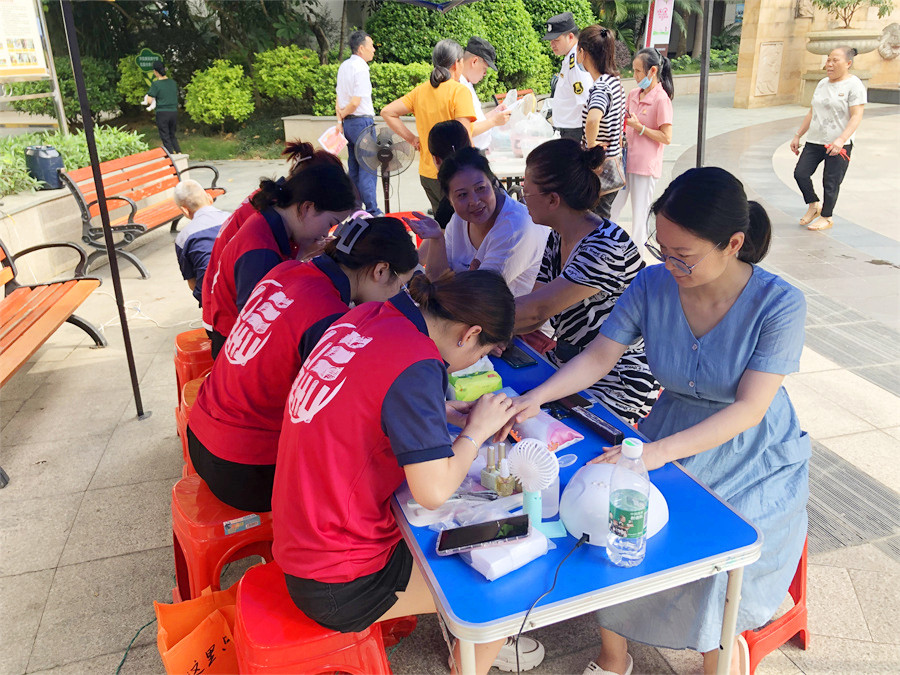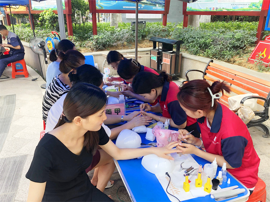 雖然有帳篷作為乘涼物遮擋,但不斷從地面向上生氣的熱氣,以及沒有任何一絲微風吹過,還是讓廣西美甲培訓班的學員們汗流浹背。但看著越來越多的居民蜂擁而至,學員們來不及擦拭額頭上的汗珠,依舊細心地詢問每一位居民的需求,然后便又快又專業(yè)的開始操作。