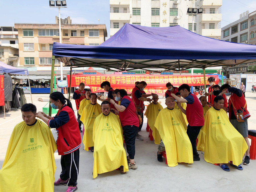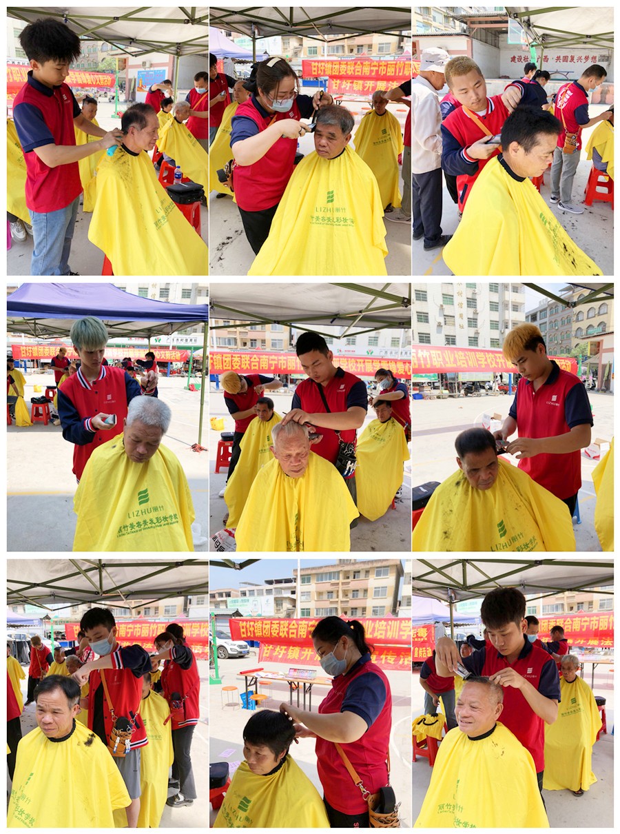 學(xué)雷鋒愛心剪發(fā)、南寧免費(fèi)剪發(fā)活動:4月16日,甘圩鎮(zhèn)團(tuán)委聯(lián)合南寧市麗竹職業(yè)學(xué)校(南寧美發(fā)職業(yè)學(xué)校)開展“學(xué)雷鋒”愛心義剪活動。在鎮(zhèn)中心的小廣場上,身著紅色麗竹學(xué)校校服的南寧美發(fā)理發(fā)培訓(xùn)班的美發(fā)志愿者搭起帳篷,擺好凳子,拿出理發(fā)工具,前來理發(fā)的人已經(jīng)排起了隊(duì),他們中有高齡老人、附近務(wù)工人員、小朋友等。