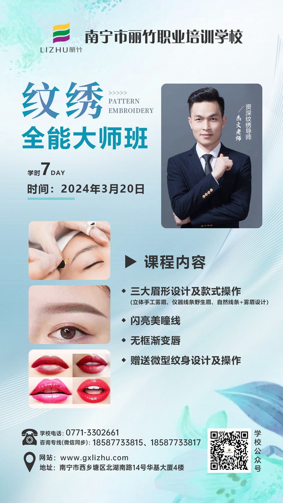 此次麗竹學(xué)校紋繡全能大師班將在3月20日開課,行業(yè)紋繡導(dǎo)師(杰文老師)手把手,一對(duì)一全程指導(dǎo),屆時(shí)將為大家?guī)砣录y繡技術(shù)以及快速有效的拓客技巧。為了不要你再次錯(cuò)過此次課程,麗竹學(xué)校友情提示現(xiàn)在報(bào)名通道已經(jīng)開通,請(qǐng)一定要提前預(yù)定,提前約!