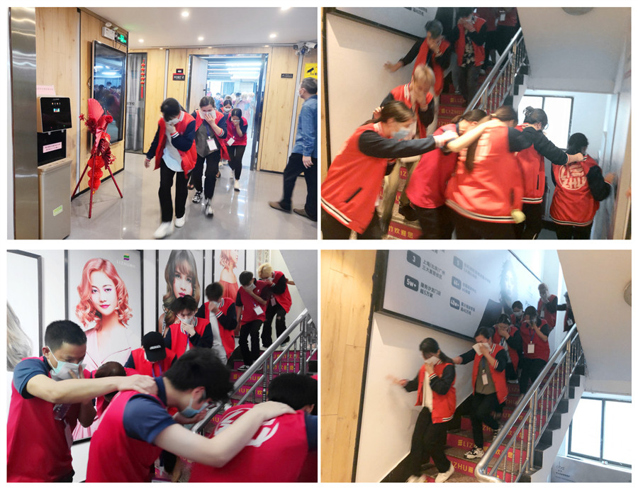 為了讓大家實地感受發(fā)生火災(zāi)時逃生的緊迫感,師生在老師和李教員的引導(dǎo)下,進(jìn)行了消防疏散逃生演練。低頭彎腰,相互將右手搭在前一個人的肩膀上,左手用濕毛巾捂住口鼻,緊貼著樓梯,有序地從樓上快速下樓疏散到安全區(qū)域。