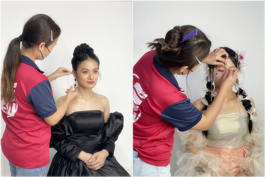 首先是在進(jìn)行發(fā)型操作時(shí)候使用的力度完全不一樣,稍微用力就會(huì)給顧客造成疼痛感,這是在練習(xí)假頭模時(shí)沒有注意到。然后就是對(duì)于時(shí)間的管理,不同于假頭模練習(xí)時(shí)可以磨磨蹭蹭,在進(jìn)行真人操作的時(shí)候必須要在規(guī)定的時(shí)間完成,因?yàn)橐粋€(gè)完整的妝造是由妝面和發(fā)型共同組成的,所以每個(gè)項(xiàng)目都要合理的分配時(shí)間。